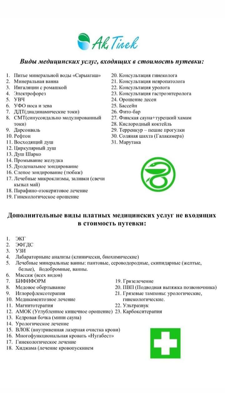 Медицинские услуги, входящие в стоимость путевки:
